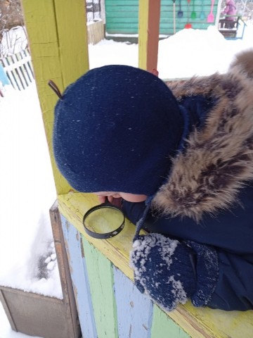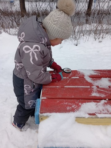 Во время прогулки дети с восторгом изучали настоящие снежинки через лупу. Каждая находка вызывала восхищение их неповторимой красотой и замысловатыми узорами.