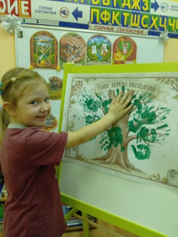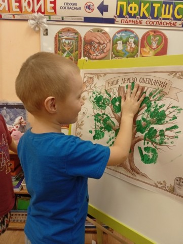 Затем ребята оживили Дерево обещаний: каждый обмакнул ладошку в зелёную краску и оставил отпечаток на ветках дерева.
